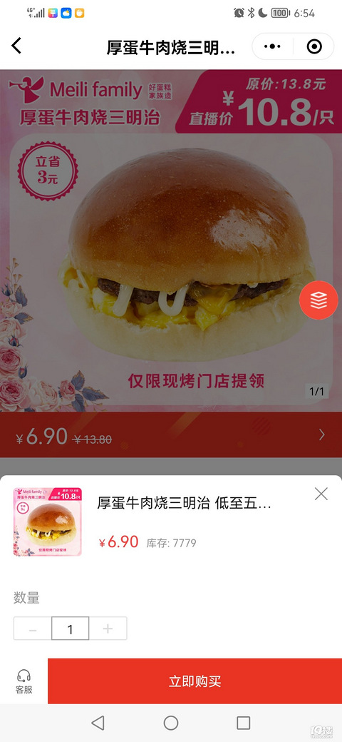 亲们快去美丽家族商城,原价13.8元现在半价只有6.9元这份厚蛋牛肉三明治真的超级划算,里面有鸡蛋还有一块很厚实的牛肉饼外加一层芝士,我觉得味道非常不错,还有性价比真的超级高,每人每天限购一份,冲鸭