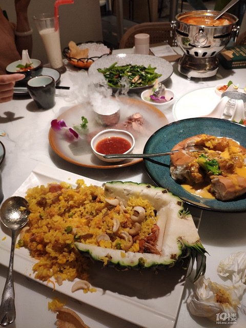 星河coco city 新商场说实话餐饮的店真的没什么可选的 甲米府新店环境不错,干净敞亮,菜品么可能我这个中国胃,吃不惯泰国菜吧,真心觉得一般般。 |泰式柠檬浸虾^酸酸辣辣的,不是很出挑 |炭烧猪颈肉^酱汁还不错,猪肉有点干柴 |菠萝海鲜炒饭^中规中矩吧 |咖喱面包鸡^咖喱汁浸透面包,面包比鸡好吃,鸡块应该是炸过得,不过表皮也不酥也不脆,反而有点硬,口感不是很好。 摆盘胜过美食本身,只能说好看。