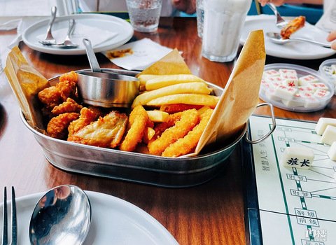 中规中矩的小吃拼盘榴莲披萨味道还是不错的,重点是要趁热吃感觉一般的牛肉炒饭这个烤鸡表面酥脆,肉质咸鲜