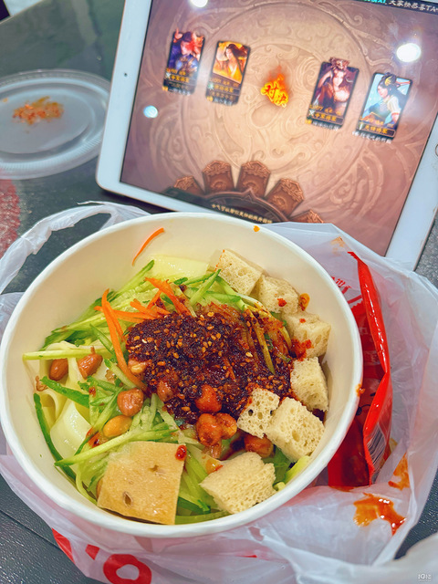 就突然间很想很想吃辣的东西。于是买起了我经常吃的凉皮+葱油饼。凉皮还点了特辣的,一打开看到上面放了一大勺辣椒!放上自带的辣椒油和大蒜汁,哇,吃起来那叫一个爽啊!葱油饼,薄薄的一大片,油放的很多,但是吃起来很香啊!一边吃饭,一边玩游戏嘎嘎乱杀,真好!