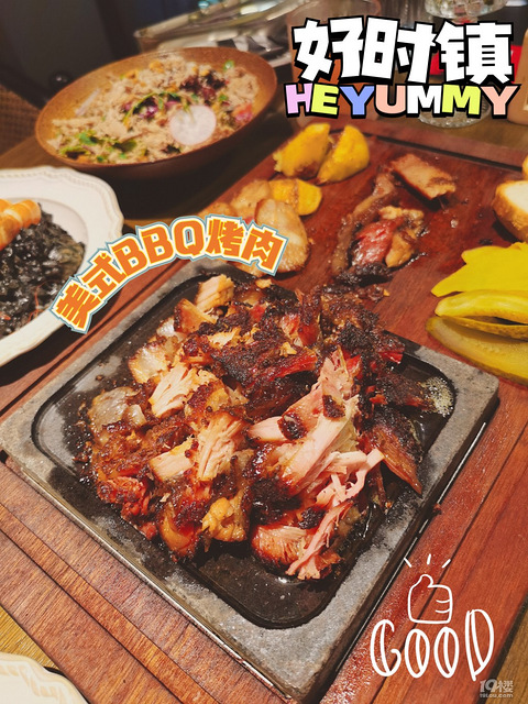 听到这家餐厅的名字,还以为是卖的呢,其实不是呀[ej=1F604] 虽然叫好时镇,但这是家西餐厅哈,主打美式烟熏烤肉,过来尝尝看这烤肉有什么不一样[ej=1F61C]美式BBQ烤肉本来我是不喜欢吃[ej=1F437]猪肉的,但是这个黑猪肉我居然吃得非常欢快[ej=1F60B]经过好几个小时的果木烟熏,看服务员帮忙切的时候就口水不停分泌了[ej=1F60D]为了解腻,可以将烤肉与配的酸黄瓜、萝卜、苹