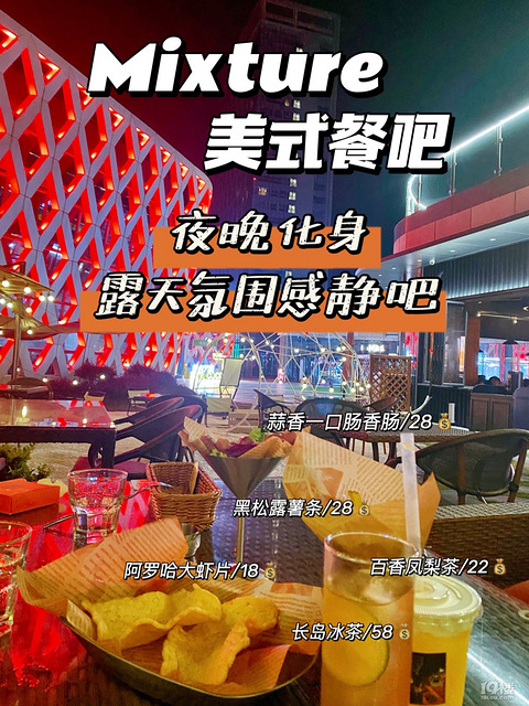 cococity里面还不错的一家美式餐吧有各种美式餐配上好听的音乐 更像是一个静吧 :Mixture美式餐吧:嘉兴市星河cococity3楼 环境分为室内和室外 会有不一样的体验感室内有灯光、环境昏暗座位也超多整体感觉比较低调有氛围 室外凉风习习,吹风散心很惬意有藤椅座位、野营座位还有一个星空屋小屋子 个人更喜欢在室外吹风真的很放松!店内大多数都是英文歌曲但是真的很好听!已经二刷了 有空就会去坐坐