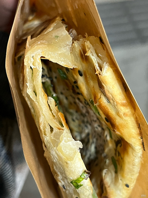 正好经过走到店门口 一股很香的炭火味道扑面而来走过去一看 是一家卖烧饼的店还有好多人在排队 本来想买一个尝尝一看价目表懵了全家福30块一个最便宜的4块平均价格都在15块左右这年头烧饼都吃不起了要但还是好奇 买了个9块钱的 葱油板油的第一口真的蛮惊艳的!他的饼皮是酥皮有点像手抓饼葱油很香的是很好吃的烧饼 但是价格还是有点贵的不知道有没有人吃过30块的全家福味道如何呢?
