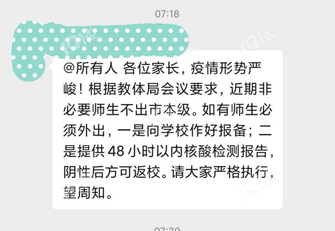 家长群里通知了:非必要不出市本级!出去了没核酸报告不得返校!