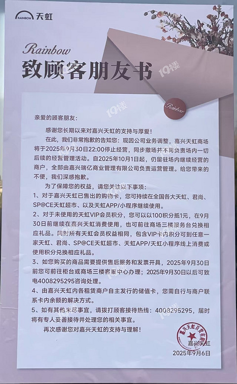 在嘉兴开了近20年!天虹百货官宣,9月30日停业!