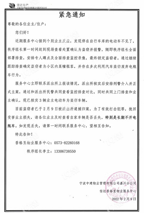 业主电瓶车停放在一楼车库,由于长时间停放被小偷钻了空子,多名业主财务收到损失!!香格里小区是否安全!物业是否有作为!物业费在周边高居榜首却无法保证业主安全。请敲响警钟