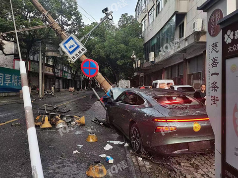 三江超市路口今早小鹏新车撞电线杆!网曝是3男2女小年轻酒驾…