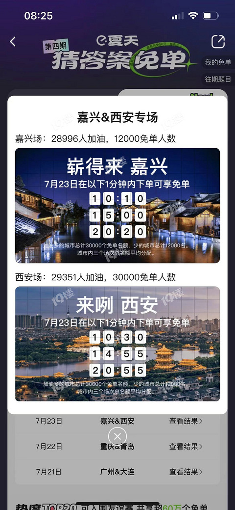 嘉兴在PK中输了,只有12000个免单名额……总共3场,分别是在下面这3个时间点,均分的话那就是4000个一场:10点10、15点、20点20 —— 嘉兴7月23号就能拥有饿了么的免单活动城市专场了! 今天需要跟西安友好PK,获得更高支持的城市,就可以在7月23日让嘉兴拥有更多免单名额。 饿了么app搜「免单」,给嘉兴点“加油”就行~赢的3万个免单名额,输的1万2个免单名额