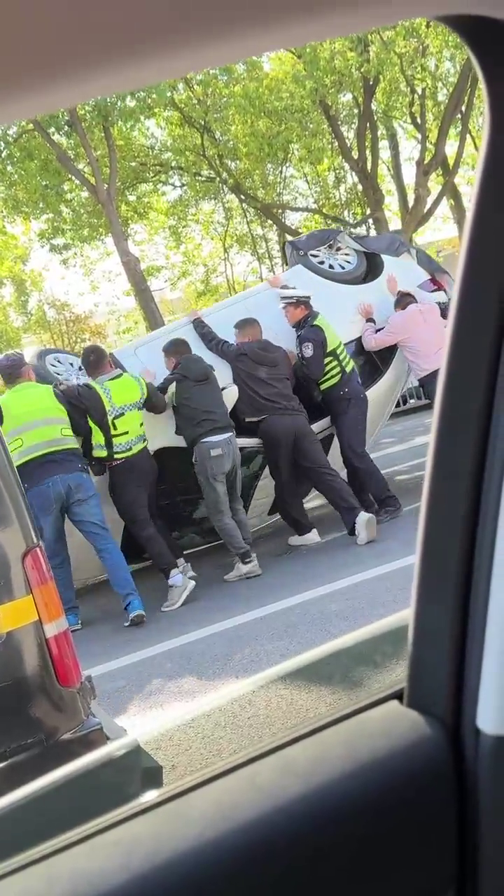 最新:黑车车主反馈,刚交警队出来,翻车的白车被判全责。 —— 黑车当事人联系19楼表示,事故系白车变道导致!下午会去交警队定责!持续关注后续! —— 后续来了!路人和交警一起把四轮朝天的车子给推回来了!正能量满满! —— [/11捂脸]早高峰大家要注意安全啊! 好多网友路过都看到了! 微信网友爆料:早上8.20分左右,在南湖大道和由拳路交叉口发生一起交通事故,白车撞了个“底朝天”,里面的人都摔懵了