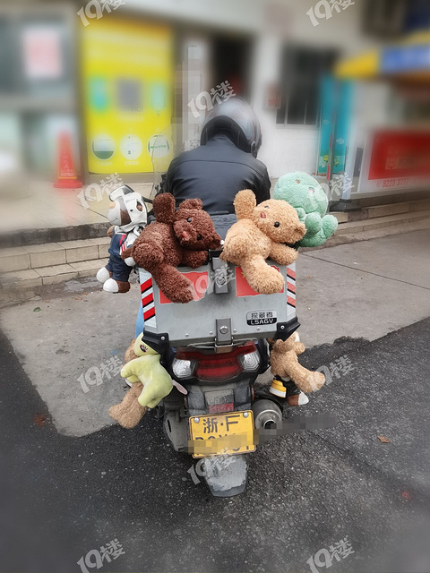 外卖小哥也蛮“萌的”,摩托车前前后左左右右挂了9只毛绒玩具!