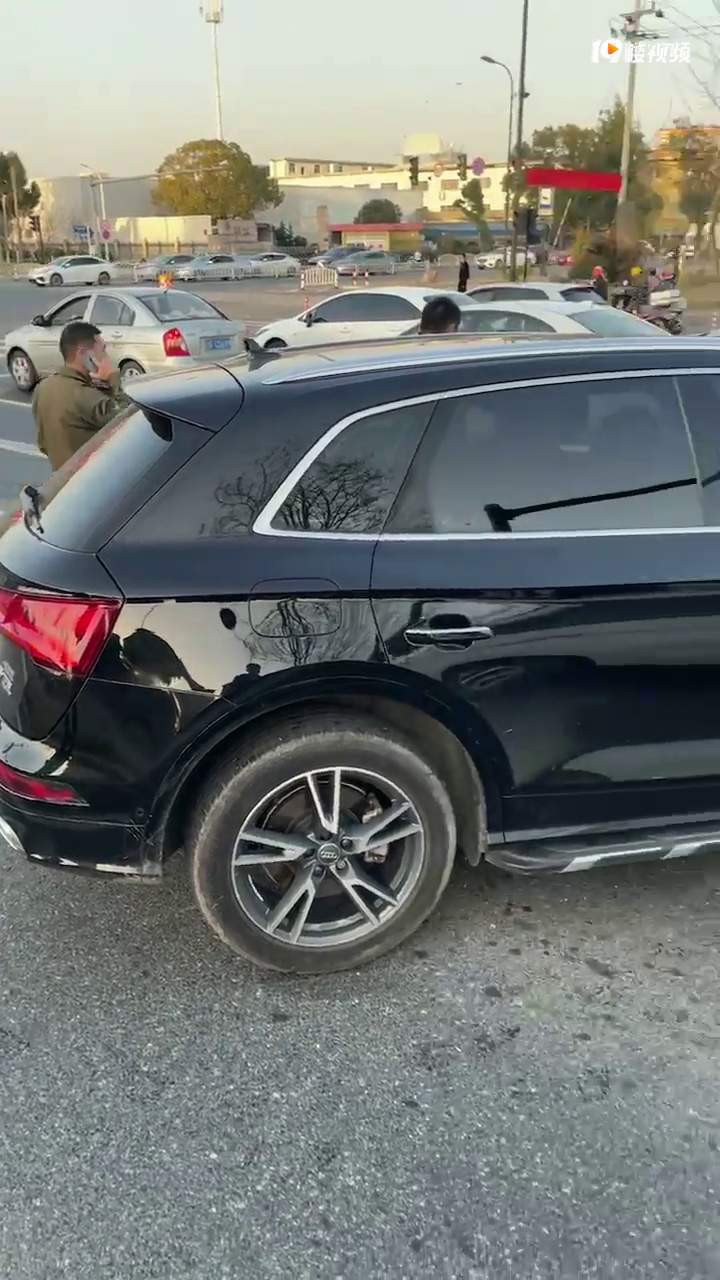 海宁一路口,一辆奥迪车转弯突然失控,撞到对向车道多辆车,其中还有一辆是宾利……