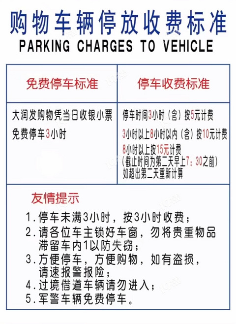 坏消息:大润发停车要收费了好消息:大润发购物凭当日收银小票,免费停车3小时!停车时间3小时(含)按5元计费,3小时以上8小时以内(含)按10元计费,8小时以上按15元计费(截止时间为第二天早上7:30之前)如超出第二天重新计算