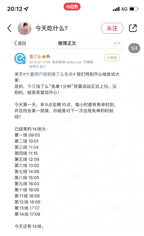 后知后觉才知道今天饿了么的1分钟免单活动,今天有超多时间点,只要你在那1分钟点外卖就是免单的。 根据晚上大家推测的时间点,我在20:50分的时候点了一单153块的,外卖送达之后不到10分钟就收到了免单的短信。看了下,钱已经退回饿了么账户了。 据说接下去每天都有免单活动,你们可以试试!明天的免单品类和时间也出来了!点咖啡、奶茶、冰饮类外卖,在16:02、17:01、18:01这几个时间点准时点,就能