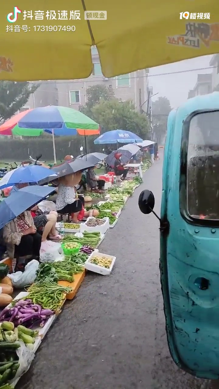 海宁,一小区门口,下雨天,老人们冒雨撑伞卖菜