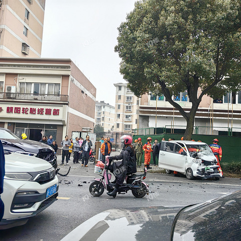 网友爆料:阳海景怡中区大门口西边,云海路上。一辆宝马超车与对向的小电动车相撞。消防人员正在破拆小电动车,解救驾驶员。
