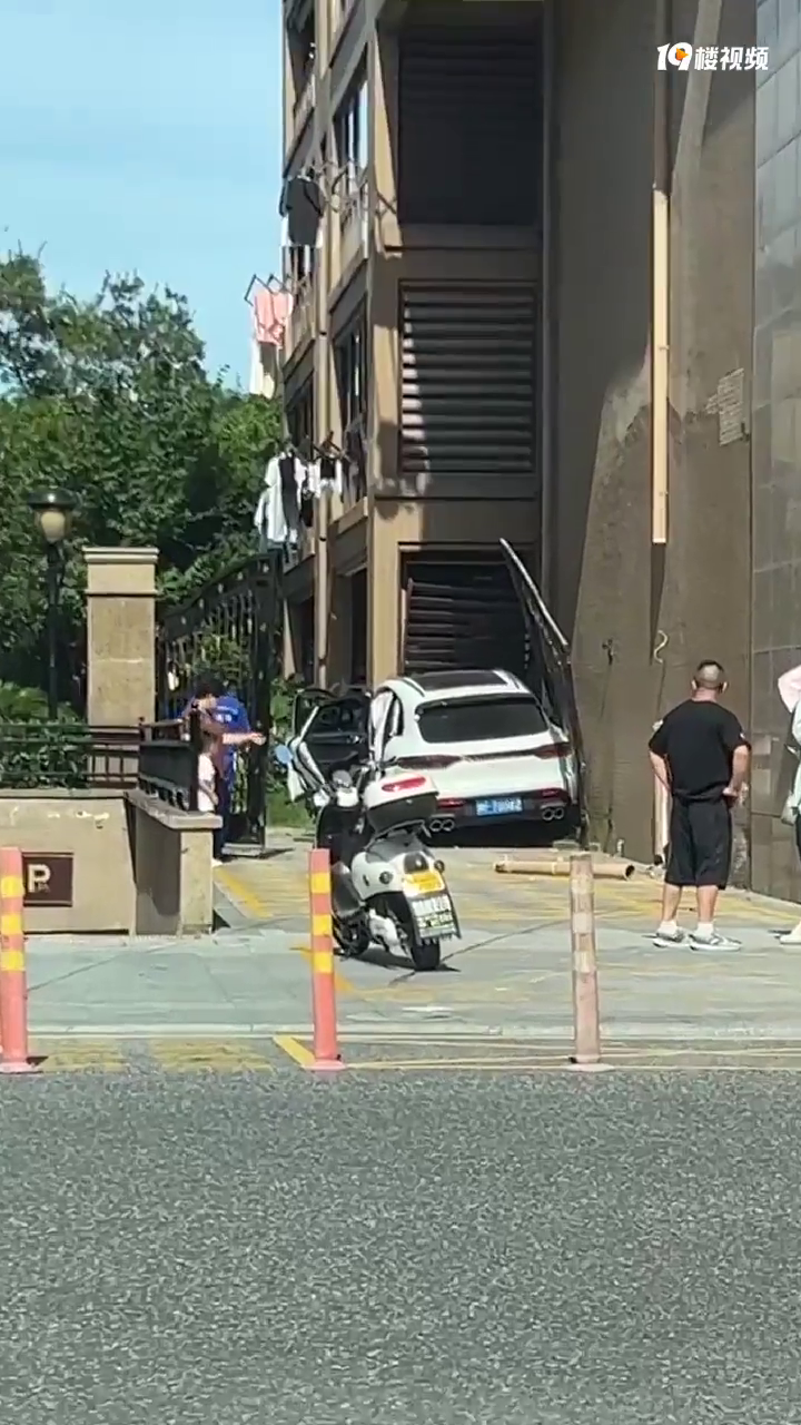 嘉兴今早突发!保时捷起飞时刻?冲过护栏怼进小区…