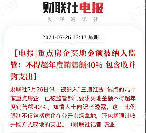 壹一个个调控“重锤”,正在不停落下。 继“三道红线”与“五档房贷”、商票纳入监管后,房企再次遭遇暴击。 据多家媒体报道,被纳入“三道红线”试点的几十家重点房企,已被监管部门要求买地金额不得超年度销售额40%。而且限制范围不仅包括房企在公开市场拿地,还包括通过收并购方式获地的支出。 打个比方来说,如果开发商销售额是100亿,那么他们最多只能把其中的40亿用来拿地,绝对不能超过这个比例。 目前,有多家