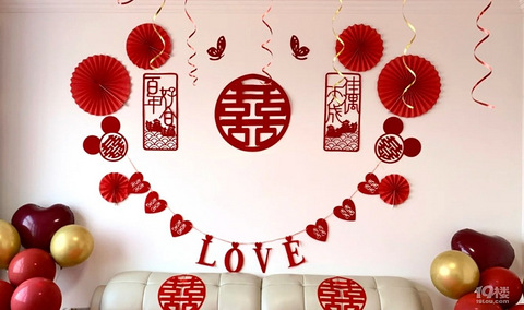结婚当天最快乐的地方,莫属接亲环节的婚房,作为快剪的一部分,怎么能不好好装饰一番,网上的装饰品是五花缭乱,金色,红色搭配的气球甚是好看,几个气球高高低低搭成一束花的造型。在吊顶灯的周围一圈氦气球安排上,红红火火中夹着金光闪闪。床背正上方贴了喜字,喜字上方新婚快乐四个小字,整个吊顶一周装饰了波浪旗,两根玫红色中有根金色。电视机上方贴了双层金粉植绒喜字,寓意双喜临门。