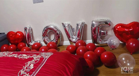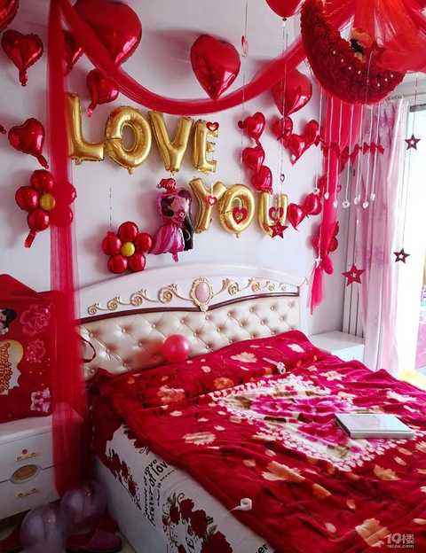 婚房布置的重要配角就是气球。氦气球的视觉效果最好,在头顶红火火的一片。把气球排列一排放置墙面上部,四周围一圈,结婚气氛搞起来,用粉色气球摆出心型照片墙,铝膜气球造型文字:ILOVEYOU1314。婚床上必须放上压床娃娃,还有红枣花生桂圆开心果摆出的早生贵子。主卧墙面上也是一样的配文,但是多了气球的装扮更显喜庆。