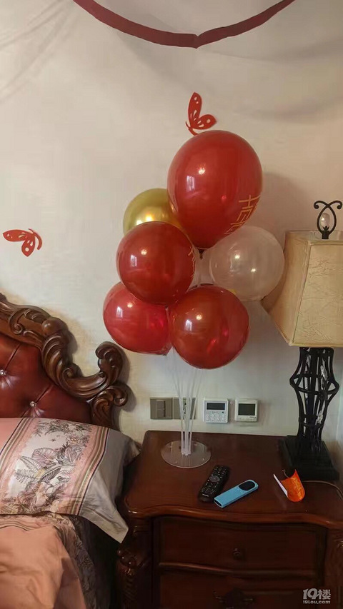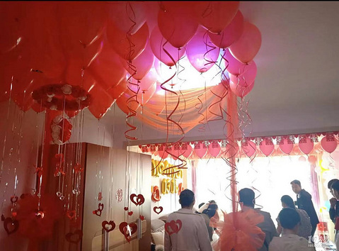 第一次结婚没啥经验,网上也买了很多气球喜字等等。考虑过用氦气,但是氦气有缺点,就是维持时间太短,只有三四个小时左右,前一天晚上弄了,第二天基本都会掉。当天早上又来不及。所以还是决定用传统的气球粘墙上。 这里千万要提醒各位,千万不要直接用胶带或者双面胶,胶点直接上墙。因为根本就弄不掉!!!撕下来会连墙漆一起掉,新房非常难看。至于布置用的气球,某宝有很多种套餐,弄起来非常好看。建议多买铝膜气