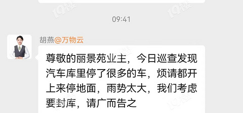 由于雨势过大,小区物业考虑封闭地下车库请车辆还停在地下车库的业主注意:将车辆停放在地面!