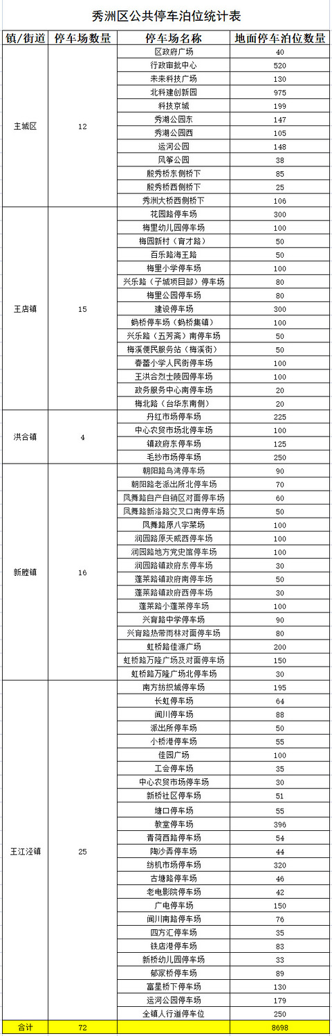 受今年第6号台风“烟花”影响,为切实保障市民人身及车辆安全,即日起,秀洲区免费开放秀洲主城区12处,2518个地面停车位;各镇60处,6180个地面停车位,供市民停放车辆。免费开放结束时段视台风“烟花”进程决定,将另行通知。 南湖区公共停车泊位 上述泊位 台风预警解除前 全部免费 对社会车辆开放