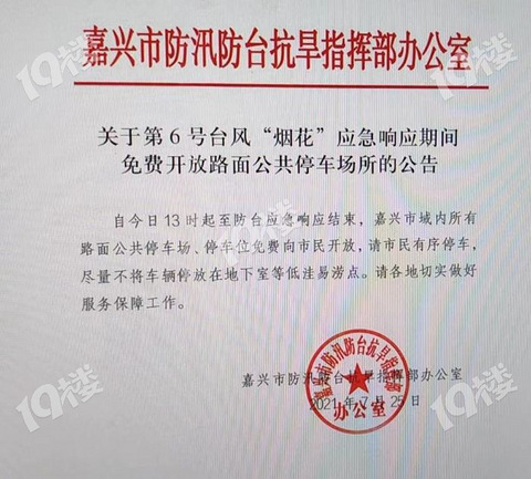 自今日13时起至至防台应急响应结束,嘉兴市域内所有路面公共停车场、停车位免费向市民开放,请市民有序停车,尽量不将车辆停放在地下室等低洼易涝点。嘉兴市防汛防台抗旱指挥部办公室同时提醒各地切实做好服务保障工作。