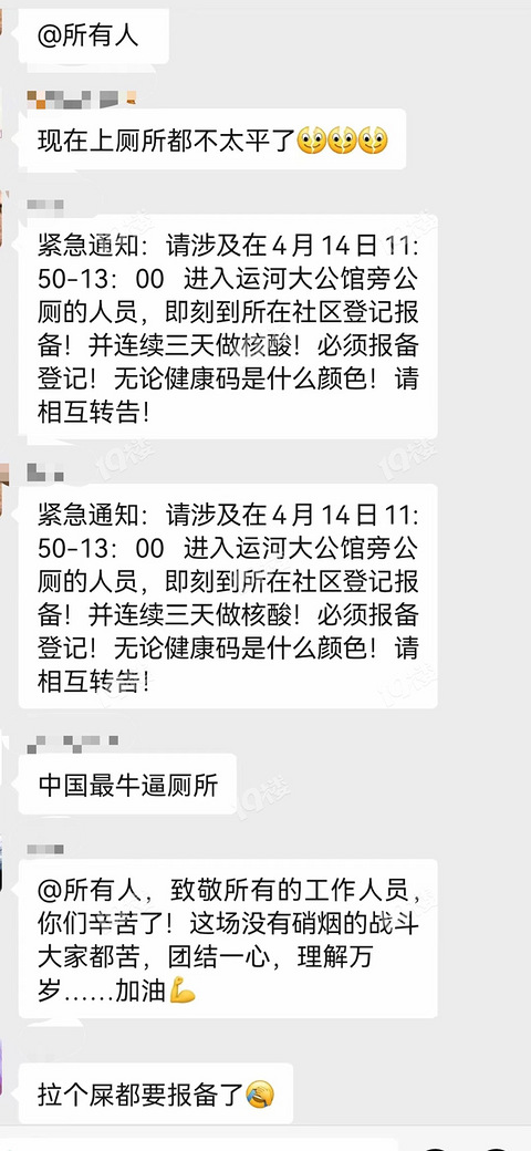 网友爆料:通知来了,去过运河大公馆旁公厕的,要连续做3天核酸……想送一句国骂给李某某!防不胜防啊,以后是不是拉个屎都要报备了? 去过超市、便利店的也要去做核酸……大家都辛苦了啊!