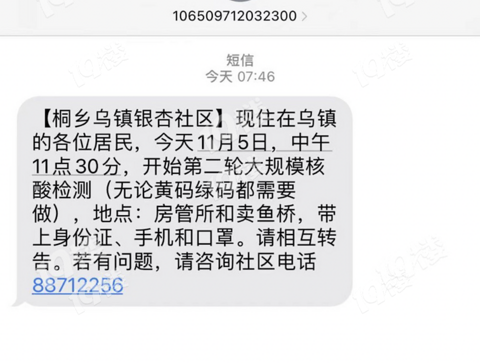 乌镇朋友收到短信,今天中午11:30分,开始第二轮大规模核酸检测,黄码绿码都要做!
