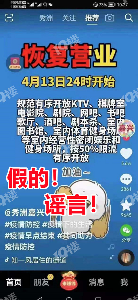 4月13日24时KTV等开始恢复营业?秀洲区辟谣:假的!