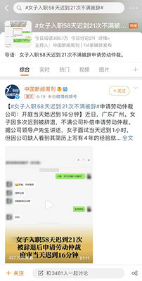 【今日回帖话题】 @嘉兴打工人你们公司允许迟到吗?迟到了有没有什么惩罚? 近日 有女子入职了58天就迟到21次被辞退后不满公司补偿申请了劳动仲裁这件事情引起了网友们的热议 许多人表示其实这个公司已经很包容了自己上班迟到不是被批评就是扣钱!每次早上一不小心多睡五分钟路上小电驴都要踩出火星子了! 百晓生表示深有同感公司规定每迟到一次翻倍扣钱!说起来都是一把辛酸泪… @嘉兴打工人 都来说说你们公司上班