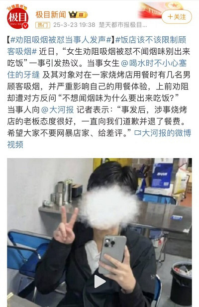 【今日回帖话题】 @嘉兴人 都来聊聊你们觉得餐饮店应该禁烟吗?为什么?说说自己的看法! 近日 女生劝阻吸烟反被怼“不闻烟味别出来吃饭”事件引发网友关注和热议 那大家今天就来聊聊你们觉得餐饮店应该禁烟吗?为什么?说说自己的看法! 百晓生先来打个样:应该禁!公共场合!更何况还是用餐的地方… 【回帖有奖】用app端回帖评论就会获得随机红包一个限量88个 先到先得哦~【回帖时间】3月24日 20:00-