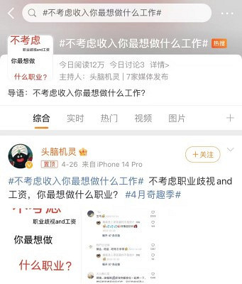 【今日回帖话题】 @嘉兴人 都来说说如果不考虑职业歧视和收入你最想尝试的工作是什么? 最近 #不考虑收入你最想做什么工作#这个话题引发了网友们的热议 大家纷纷提出了自己的奇思妙想摸金、赶海、群演、农场主… 各种五花八门的工作被提名 @嘉兴人 如果是你的话在不考虑其他条件的情况下你最想尝试什么工作呢?都来评论区留言说说吧 【回帖有奖】用app端回帖评论就会获得随机红包一个限量88个 先到先得哦~
