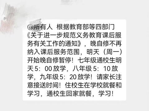 【今日回帖话题】 浙江多地取消初中晚自习!@嘉兴人 你支持取消吗?都来说说你的看法! 今天家长群里一阵骚动省内多个城市的学校取消初中晚自习了! 嘉兴这边,也已经有学校发通知周一到周四照旧但周五晚上不上了! 家长群里各执己见有的说取消的好有的抱怨取消了没人接孩子… 今天大家就一起来说说你支持初中取消晚自习吗?都来说说你的看法~ 百晓生先来打个样:我肯定是支持的但像我姐姐家这种双职工然后服务又在老家