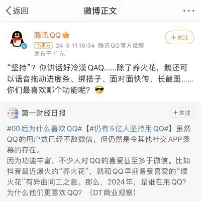 【今日回帖话题】 @嘉兴人 都来说说你用QQ多少年了?上一次用是什么时候? 今天#仍有五亿人坚持用QQ#登顶微博热搜引发热议腾讯QQ官方更是发文回应:“坚持”?你讲话好冷漠QAQ…并向网友安利了QQ好用的功能 虽然QQ的用户数已经不敌微信但仍然是令其他社交APP羡慕的存在根据月狐数据2023年12月的统计QQ月活跃账户数比微博和知乎加在一起还要多,达到5.9亿 作为曾经的社交APP顶流各位网民都