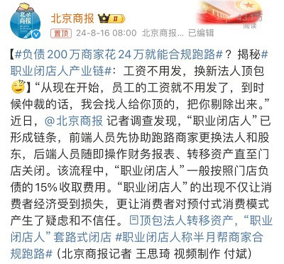 【今日回帖话题】 大家遇到过商家跑路吗?觉得哪些店容易踩雷? 近日 据北京商报曝光了“职业闭店人”的套路↓↓↓“从现在开始,员工的工资就不用发了,到时候仲裁的话,我会找人给你顶的,把你剔除出来。”近日,@北京商报 记者调查发现,“职业闭店人”已形成链条,前端人员先协助跑路商家更换法人和股东,后端人员随即操作财务报表、转移资产直至门店关闭。该流程中,“职业闭店人”一般按照门店负债的15%收取费用。