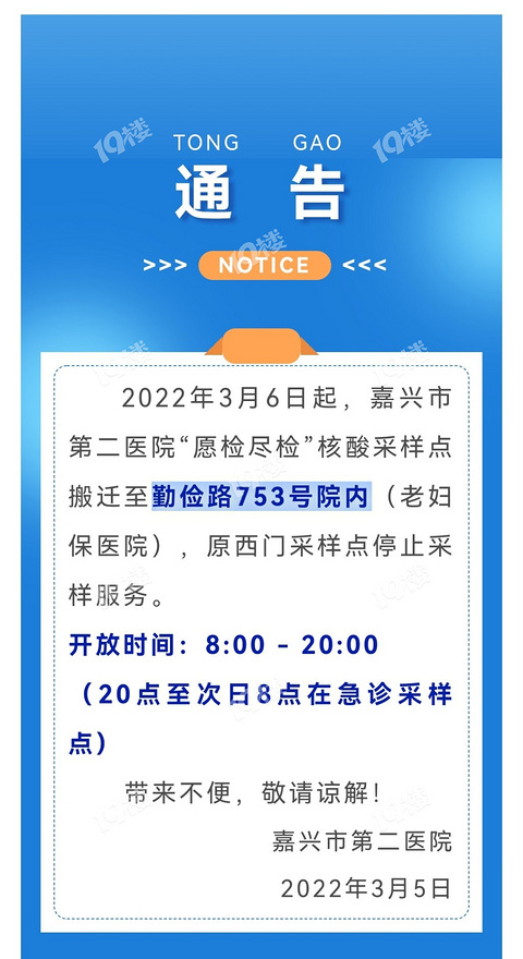 通告嘉兴市第二医院“愿检尽检”核酸采样点搬迁至勤俭路753号