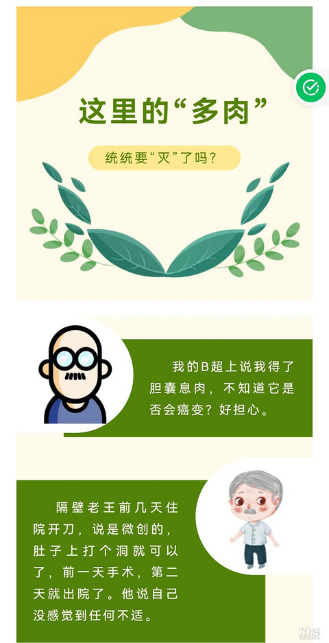 很多人都有胆囊息肉那么胆囊上面的“多肉”——胆囊息肉到底是咋回事儿?它严重吗?必须得做手术把它“干掉”吗? 什么是胆囊息肉 胆囊息肉是指胆囊粘膜表面隆起并突向腔内的一类病变的统称,也称为“胆囊隆起性病变”,可以分为肿瘤性息肉和非肿瘤性息肉。临床上以非肿瘤性息肉居多,包括胆固醇性息肉、炎性息肉等;肿瘤性息肉以腺瘤最为常见,还有不多见的血管瘤、脂肪瘤等。其中,以胆固醇性息肉、腺瘤(腺瘤性息肉)、腺肌