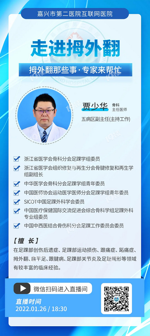 1月26日(下周三)18:30,嘉兴市第二医院五病区副主任(主持工作)贾少华做客直播间,本期直播主题为“走进拇外翻”,市民朋友们届时可通过长按识别下图二维码收看直播。 广告