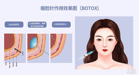 Q肉毒素在我们脸上是怎么发挥作用的A肉毒素作用于胆碱能运动神经末梢,可以暂时阻断神经末梢释放乙酰胆碱,使神经支配的肌纤维不能收缩,从而使皮肤舒展,皱纹消失或肌肉萎缩达到瘦脸的作用。 Q哪些情况可以打肉毒素A比如有明显的鱼尾纹(眼周细纹)、额纹、眉间纹、鼻背部皱纹(鼻子山根处的横向皱纹)、咬肌肥大、小腿粗大及其他动力性皱纹都可以打肉毒素。 Q哪些人不能打肉毒素A严重心理障碍,严重心、肺、肾功能不全,