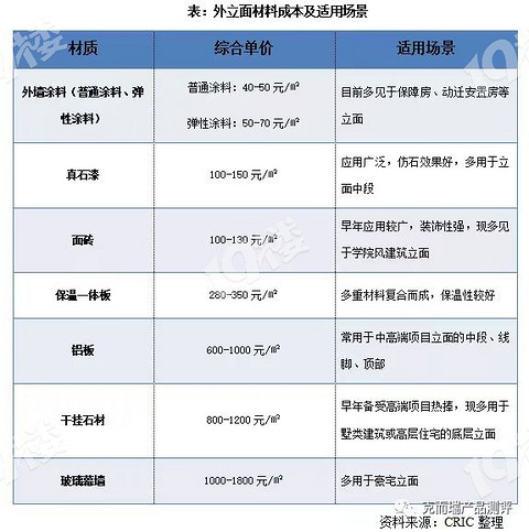目前市面上的在售盘外立面主要分成一般涂料,真石漆,水包水(乳胶基涂料),面砖,保温一体板,铝板,干挂石材,玻璃幕墙等。嘉兴市区除了玻璃幕墙,剩下的几种都有。老陈和大家盘一盘一般意义上他们的优缺点(一般而言,不考虑各家施工的水准,最终效果施工也占一半的要素)首先放一张克而瑞的各类立面造价参考,仅供参考,实际上根据材料的差异价格会有较大的波动。 ————————————更正注:据反馈,留香园的外立面也