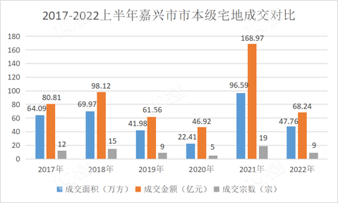 2022年整个上半年,风平浪静依然成为定局。 随着118首次土拍拉开帷幕,开门标红!两块地熔断+竞配建。但随着519土拍的落幕,除一块被紫城拿去,其余均为城投拿地,土拍市场趋于稳定。纵观整个2022年上半年,嘉兴市本级土地供应量减少,土拍市场逐步趋于冷静。 2022年上半年,嘉兴市本级土地市场共9宗宅类用地挂牌出让,出让地块数量同比2021年上半年下跌约52.63%。总成交面积约47.76万方,成