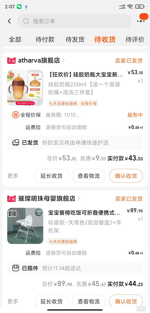 有了孩子以后发现买的东西都是关于孩子的,自己也就是买了条裤子。一直不愿意喝奶瓶,不知道这个新奶瓶能不能吸引他,餐桌椅确实是解放双手,坐在摇摇椅上死活不愿意了,坐这个还是挺开心,买了最简单的款式,方便清洗。
