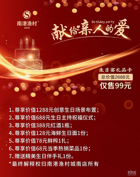 南港渔村年度重磅福利,5月28日正式开售!尊享2688元的生日卡,仅售99元八大豪礼 , 一站式服务!南港渔村生日卡|献给亲人的爱预定电话:13375735550
