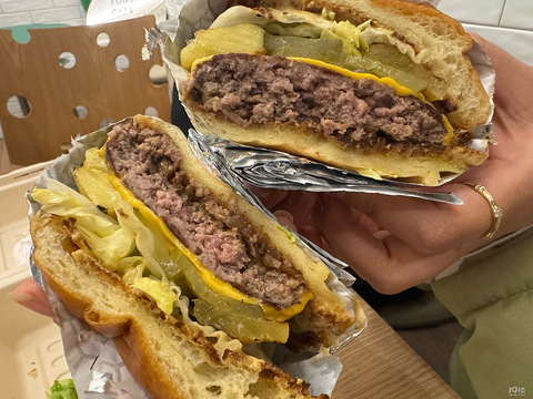 常去的咖啡店上新汉堡啦,就是一般只有晚上有!点了2款都不错呢!一件是美式经典牛肉汉堡:阿根廷谷饲眼肉+澳洲和牛、番茄、酸黄瓜、生菜、洋葱,都是自己做的配料!牛肉非常嫩!还有一款是金钻凤梨的,比上面的多了块凤梨,蛮解腻的!
