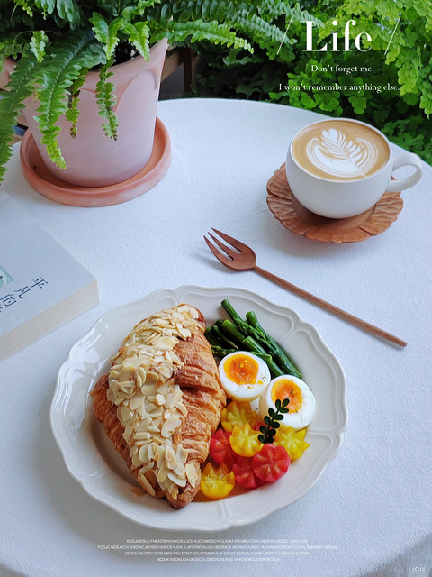 早餐:「杏仁可颂」「煎芦笋」「水煮蛋」「小番茄」「咖啡」 你有每天认真吃早餐吗?今天吃MorningBakery杏仁可颂,里面居然还有馅,是我喜欢滴