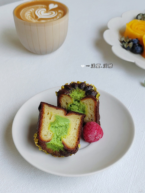 早餐:「开心果碱水」「开心果可露丽」「煎牛排」「芒果」「蓝莓」「咖啡」开心果元素的都好喜欢!第一次买可露丽(huhu家)外脆里嫩,开心果碱水包(morningbakery家 )