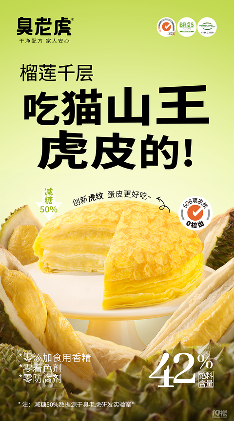 榴莲脑袋有福了!满口都是榴莲果肉的千层蛋糕来啦!【臭老虎-猫山王虎皮榴莲千层】下料真 用料狠 干净配方一半都是榴莲肉 真爆浆! 诚实用料 干净配方现市面上大多榴莲千层添加剂太多,榴莲果肉含量低。大多用植物奶油,反式脂肪酸太高,用的还是榴莲泥,连品种都不知道。 臭老虎榴莲千层0香精0色素0防腐,甄选品牌动物奶油≥36%,0反式脂肪酸只用马来西亚A级猫山王榴莲,果肉≥42% 配方经50+次升级榴莲品种