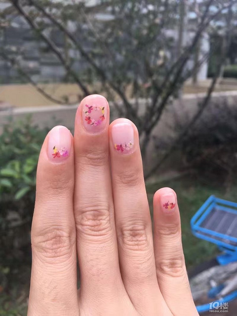 在网上找了图片给美甲店做的,差别很大,但是是两种不同的美!花朵都是干花,贴上去的,也耗费了一个多小时!,看起来特别小清新和百搭