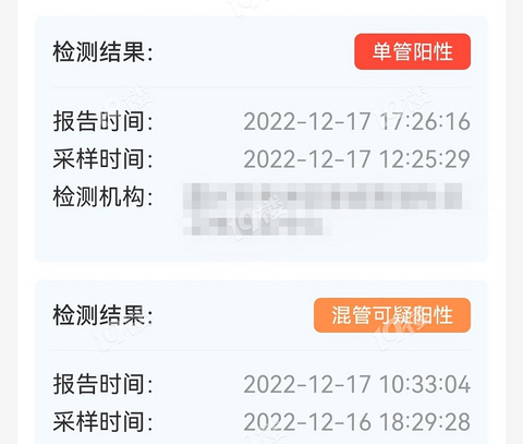 12.12省外回来当天做了核酸 核酸检测结果阴性 整体身体状态都非常好 12.13白天身体没出现任何不适感,但是晚上开始出现酸痛感(这里有点对不起我的朋友-一起跟他吃了饭-所以他也阳了) 12.14上午嗓子干痒 流鼻涕 内心开始自我怀疑 去做了核酸 (报告如下-一直未出结果)做完核酸之后 身体不适感愈发明显-明显的发虚怕冷 头晕下午开始头疼加重 但还是能够忍受的头疼 然后下半身酸痛 坐着也难受躺着